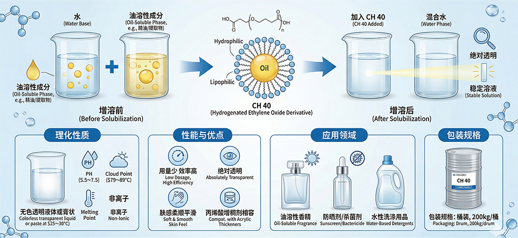广州市拓新化工科技有限公司推出的CH40增溶剂,以其无色透明、高效增溶的特性,在清洁行业中脱颖而出。这款氢化环氧乙烷衍生物,不仅能让多种油溶性成分在水中稳定溶解,还极大提升了产品的安全性和环保性,成为化妆品及日用品生产领域的优选材料。