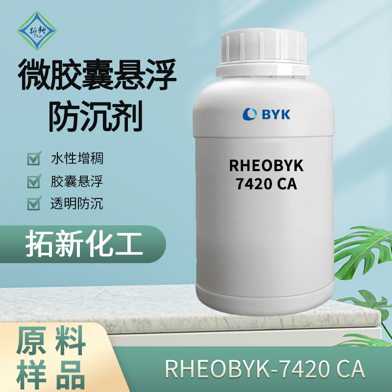 毕克化学RHEOBYK-7420 CA水性透明悬浮剂防沉剂增稠剂改性脲,RHEOBYK-7420 CA的化学组成是改性脲溶液,黄色液体,活性物质含量52 %,密度 (20°C): 1.10 g/ml,溶剂环酰胺,闪点 123°C。RHEOBYK-7420 CA液态流变剂,产生触变效果,用于水性和高极性体系,提高防沉降和抗流挂性能。